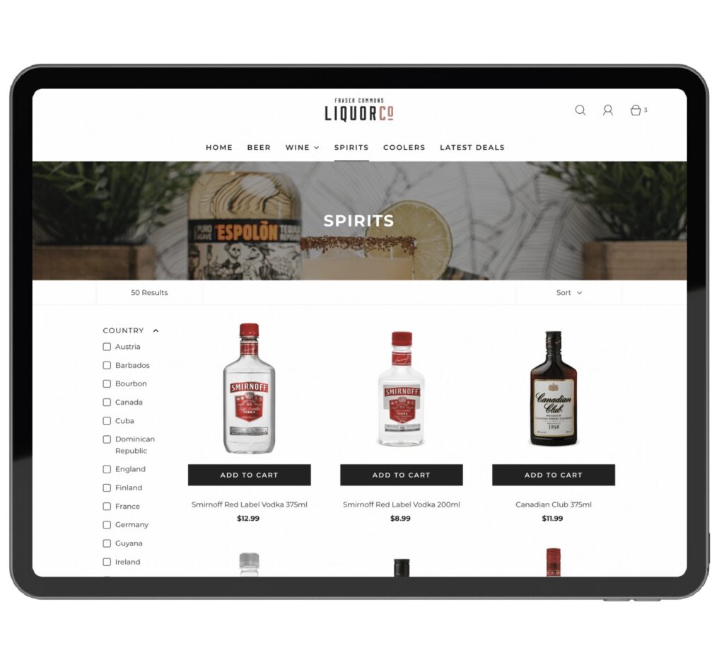 Fraser Commons Liquor Co. has a very large inventory, with several thousand items available for sale, so organization of the products was essential. Our goal was to re-create the in-store experience with products falling into categories such as Country, Region, Type & Style. This filtering system is found throughout the site.