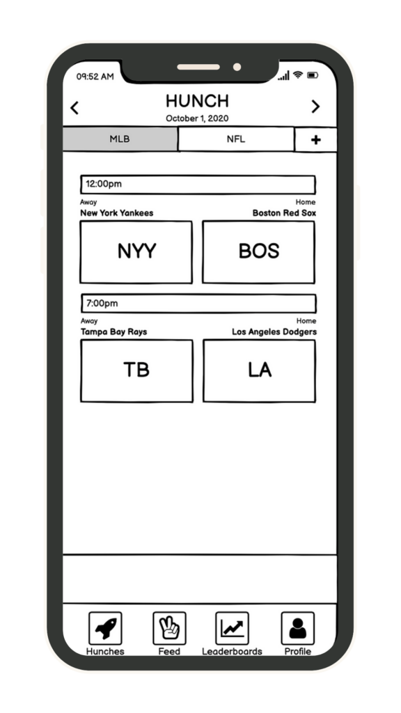 Next, planned out how to allow for a ‘Huncher’ (or player) to make their picks and how to best layout the game so it wouldn’t require any learning curve at all. Each ‘Huncher’ would have their own profile and choose which leagues they wanted to play in. They would be able to track their success against other ‘Hunchers’ via a Leaderboard.